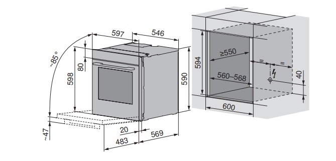 - Габариты ниши для встраивания ВхШхГ, мм: 594-600х560-568х560